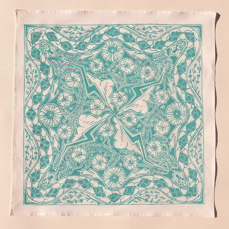 In the Monsoon Bandana, clouds and lightning bring Arizona Poppy, Desert Marigold, Devils Claw flower, and Dogweed. A painting of violence and softness, cycles and new growth, it was painted with the intention that it would bring on the rains in July.